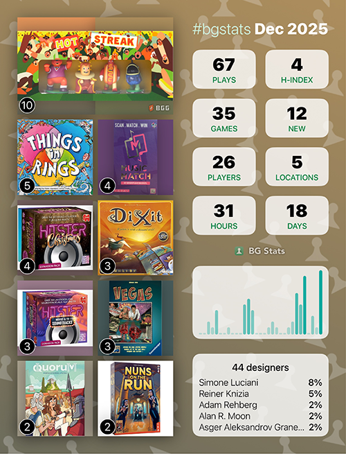 In het jaaroverzicht hieronder is te zien dat het om 107 nieuwe spellen ging. Verder bijna 700 spellen gespeeld dit jaar. Dat is voor mij een record en comfortabel binnen het streven van gemiddeld 1 spel per dag. Flip 7 was dit jaar het populairst. Is natuurlijk ook zo gespeeld. Van The Hobbit There and Back Again moeten we nog wat hoofdstukken spelen, dus die verwacht ik volgend jaar ook wel te zien.