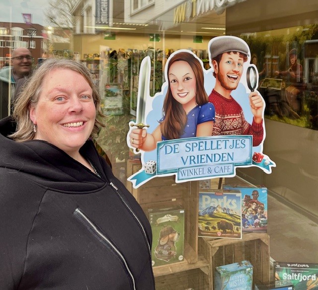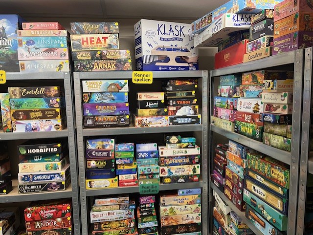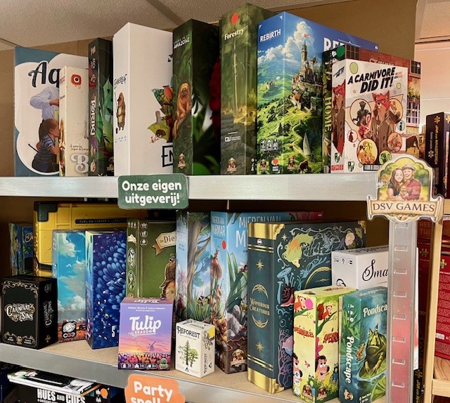 Maar voor ik daaraan begin wil ik het eerst hebben over een hoogtepunt van deze maand, namelijk ons bezoek aan de pop up spellenwinkel/café van De Spelletjesvrienden in Zevenaar. Niek en ik waren in de buurt en besloten er langs te gaan. Ik had van te voren op hun website gekeken of ik nog een tafeltje kon reserveren, maar dat lukte helaas niet meer. Maar toen we binnen kwamen bleek er toch plek. Gastvrouw Sonja vertelde dat het reserveringssysteem nog wat hickups heeft en raadde aan om een volgende keer even van te voren een mailtje te sturen. We kregen een fijne tafel toegewezen, we bestelden een drankje en kozen daarna een spel uit de grote spellencollectie. We gingen natuurlijk voor een spel van DSV Games (de eigen uitgever van de spelletjesvrienden), namelijk Aquaria. We kregen van Sonja de opdracht om het spel zelf even klaar te zetten op basis van de uitleg in het boekje. En voor we daar klaar mee waren kwam Michiel ons vervolgens het spel uitleggen. Hij vertelde dat hij het spel ook op het Spellenspektakel al een flink aantal keer had uitgelegd en dat was te merken. Aquarium is best een complex spel, maar hij gaf een heldere en volledige uitleg. Dat heb ik wel eens anders mee gemaakt. We hebben tijdens het spelen nog een keer een lekkere tosti besteld. En na ons potje Aquaria speelden we ook nog een potje Pondscape, na wederom een fantastisch goede uitleg. Wat ik van deze beide spellen vond, lees je verderop in dit blog, maar ik kan vast verklappen dat ze allebei mee naar huis gingen. Ik vind het echt jammer dat ik niet dichterbij Zevenaar woon, ik was graag vaste gast geworden in dit ontzettend leuke bordspellencafé. Het is hier echt goed toeven als spellenliefhebber. De tafels staan niet te dicht op elkaar, de temperatuur is aangenaam en de lucht is fris, het is gezellig druk, er is een flinke collectie met interessante spellen om te spelen en een groot deel daarvan kan door het aanwezige personeel desgewenst worden uitgelegd. En op de terugweg naar de uitgang loop je door het winkelgedeelte. Wat wil je nog meer! Als je in de gelegenheid bent om langs te gaan, dan zou ik dat zeker even doen.