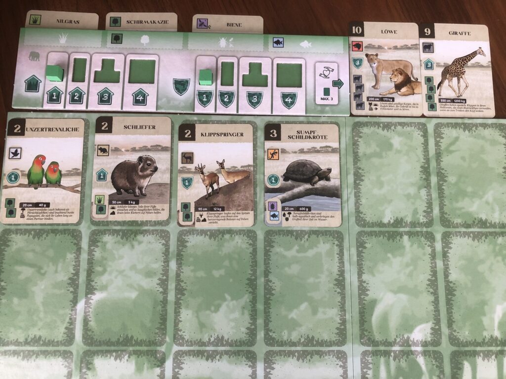 Zowel het natuurreservaat als het spel Kavango nemen veel ruimte in beslag. De persoonlijke reservaatborden zijn enorm, maar tegen het einde altijd goed gevuld met alle dieren die je verzameld hebt. Omdat je veel dierkaarten speelt en het spel er ook heel veel bevat, loont het om je ergens op te richten. Ga je voor de grote grazers, worden het de carnivoren of toch maar vogels van verschillende pluimage?