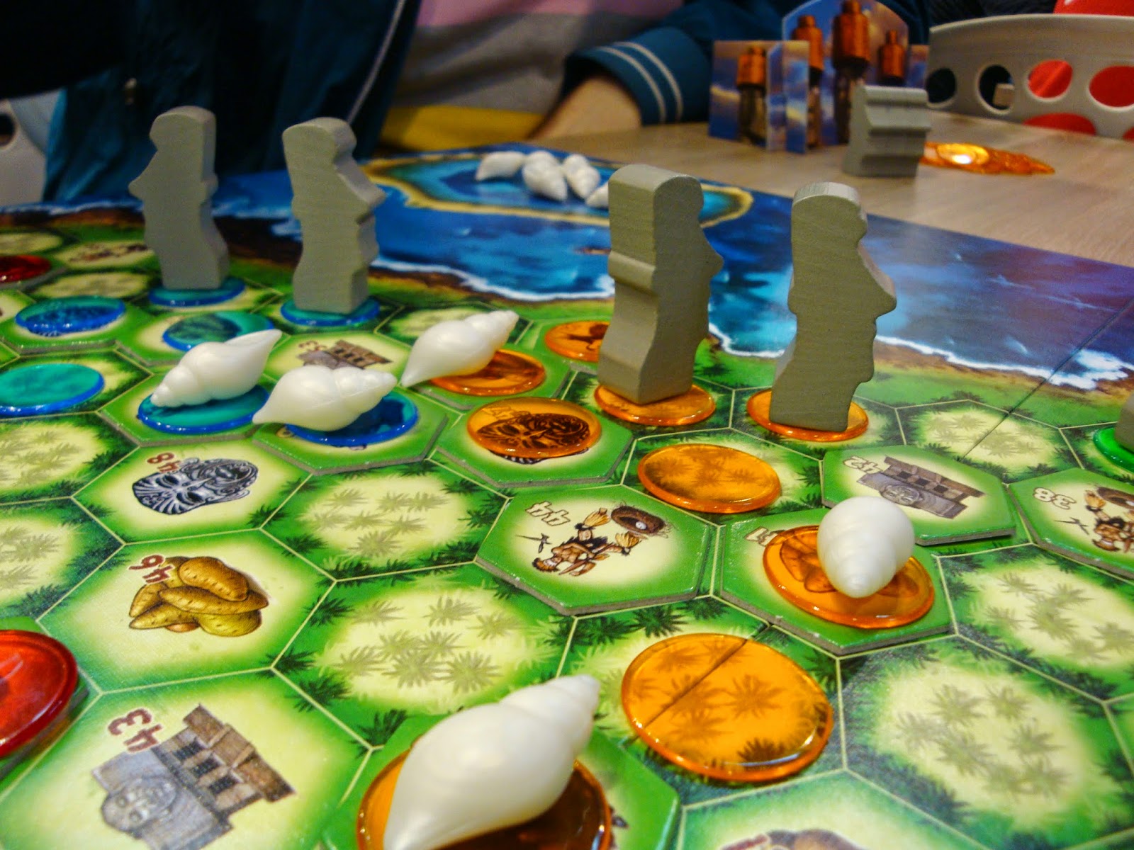 We vonden vervolgens een plekje in de Ravensburger stand. Peter Hein wilde Orongo graag proberen. Dit spel stond hoog op zijn wishlist, maar Rogier en Frank hadden het spel op vrijdag gespeeld en er weinig aan gevonden. Daardoor was het spel van blind kopen gezakt naar try before you buy. Orongo speelt zich af op Paaseiland. De spelers moeten aan de slag om grondstoffen te verzamelen waarmee ze de bekende beelden (Moai) kunnen maken. De grondstoffen verzamel je door ze te claimen door er een fiche op te leggen. Als je vervolgens twee fiches met de juiste grondstoffen verbonden hebt (een keten van fiches) dan kan je die gebruiken om een beeld te bouwen. Iedere ronde wordt er door middel van een veiling bepaald wie hoeveel fiches mag leggen. De winnaar moet zijn inleg betalen aan de bank en als iemand niets heeft geboden dan mag diegene het geld uit de bank pakken. Orongo is dus een combinatie tussen een veilingspel en een combinatiespel en legspel. Ik vond het redelijk suf, maar de heren waren er alle drie wel over te spreken. Try dus before you buy!