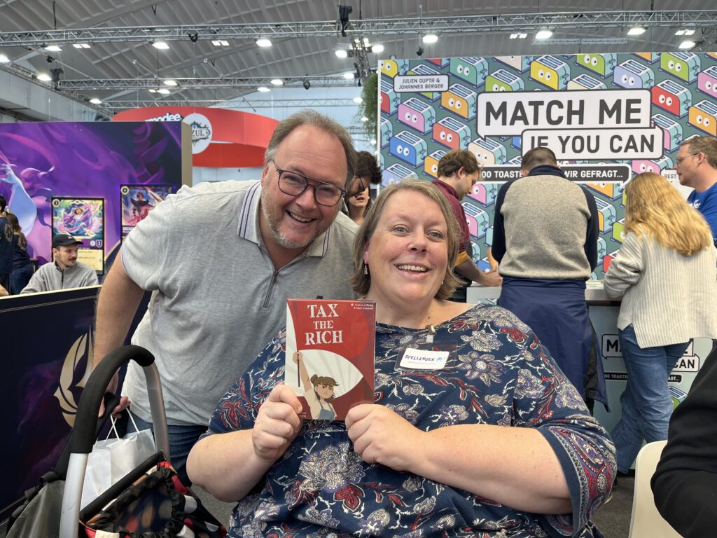 Ik wilde heel graag Tax the Rich kopen en dat spel werd verkocht in een winkel waarin onafhankelijke uitgevers hun spellen verkochten. Voor deze winkel stond ook een gigantische rij. Ik schatte in dat ik zeker een uur in de rij zou moeten staan en daar had ik geen zin in en ging dan nog liever zonder dit spel naar huis. Online kan je tegenwoordig bijna alles krijgen per slot van rekening. Maar ik had een gelukje. Mijn mede All Games on Deck cruiseganger Hilbert wilde ook Tax the Rich hebben. Hij moest bij dezelfde stand ook een preorder ophalen en voor die balie stond een veel kortere rij. Hij heeft daar zijn liefste glimlach opgezet en gevraagd of hij twee Tax the Rich mee kon krijgen en dat mocht. En dus ben ik met Tax the Rich thuisgekomen (mijn dank ik heel groot, Hilbert!).