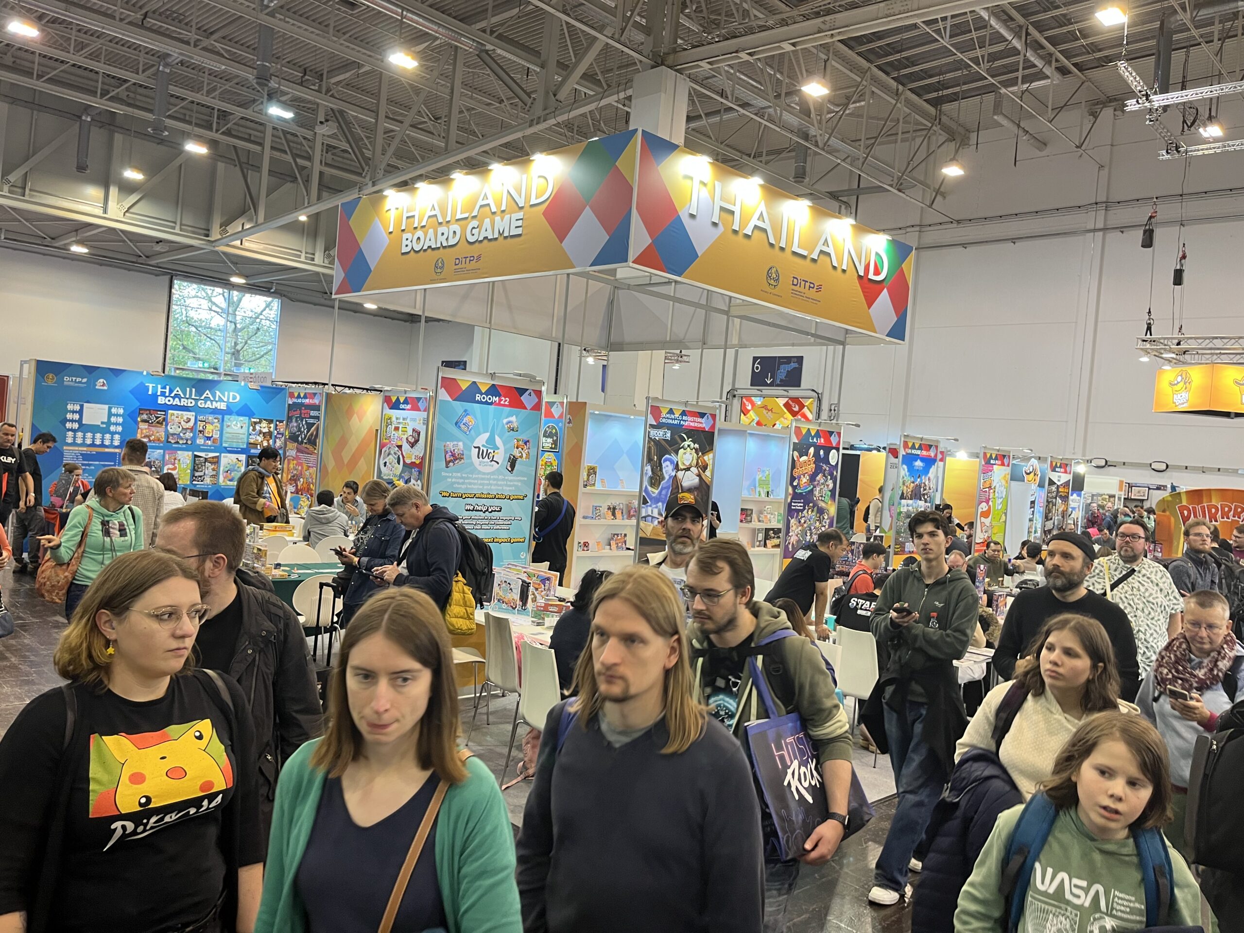 Voor het spelen van spellen ben je verder natuurlijk afhankelijk van de uitleggers. En daar hebben we een aantal hele goede van getroffen. Die op een gestructureerde wijze, rustig het spel uitlegden en daarna nog even bleven zitten om ons op weg te helpen. Chapeau daarvoor. Het lijkt me heel pittig om in zo’n drukke omgeving, vaak staand naast een tafeltje mensen een spel uit te leggen. Soms zelfs in een taal die niet jouw moerstaal is of juist aan mensen die jouw moerstaal niet spreken waardoor je af en toe wat verwarring hebt. En ondertussen zitten aan andere tafels mensen te wachten op een uitlegger (dat zou mij stress geven).