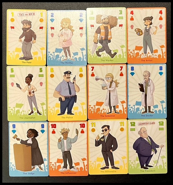 Maar het spel is niet alleen grappig door het thema, het werkt ook gewoon. Het is een leuk slagenspelletje met een interessante twist doordat je in wisselende teams speelt en de manier waarop de regels tijdens het spel kunnen veranderen. Het is daardoor ook een beetje onvoorspelbaar. Denk je net lekker de hoogste kaarten in een kleur te hebben, breekt een revolutie uit waardoor je niets meer binnenhaalt. Dat kan frustrerend zijn, maar levert weer veel leedvermaak op voor de andere spelers.
