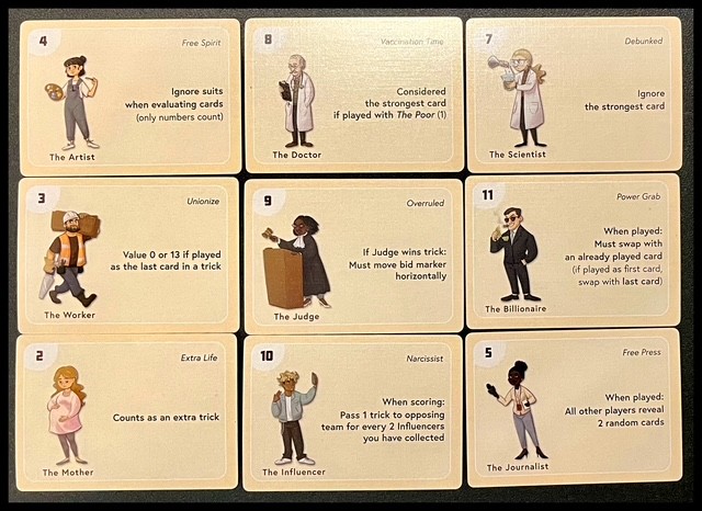 Tax the Rich is een heel origineel slagenspel. Ik heb echt lol om de linkse humor die er in is verwerkt. Zo lees je in het regelboek dat als de speler met de laagste kaart een kaart mag afpakken, dat voor het uitleggemak stelen wordt genoemd maar dat in werkelijkheid belastingheffing en het herverdelen van vermogen natuurlijk aangemoedigd wordt als een leuke en gezonde activiteit voor iedereen. Verder staat in het (Engelse) regelboek dat als je moeite hebt om het woord Trump (troef in het Engels) te gebruiken, je ook prima een ander woord mag gebruiken, zoals bijvoorbeeld Obama-kaart.