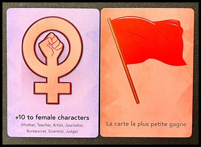 Maar er zijn dus twists. De eerste daarvan is dat je niet met de hoogste kaart mag uitkomen. De tweede kleine twist is als je met de laagste kaart een slag haalt dat je een slag mag afpakken van de speler met de meeste slagen. Maar de belangrijkste twist is dat je de revolutie mag uitroepen. En daarbij kan je zowel voor de klasse revolutie als voor de feministische revolutie gaan.
